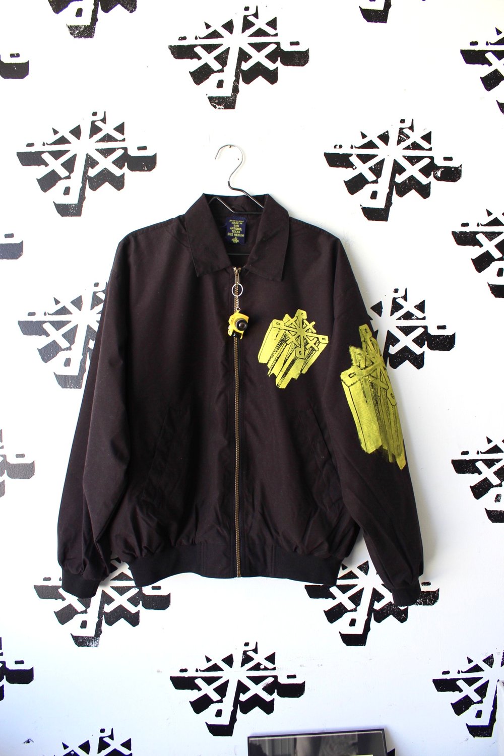 Polyester jacket featuring hand silkscreen printed designs on front, back, and left sleeve with charm on front zipper. #prayxplot