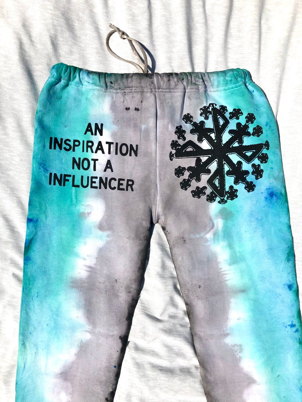 Vintage cotton and polyester blend hand dyed sweatpants featuring hand silkscreen printed designs on front and back.